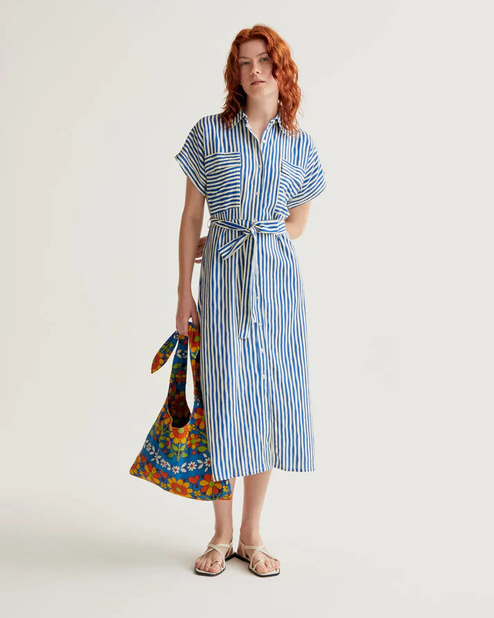 Lavagna blue print midi dress. Lapel collar and dropped shoulders. White button front closure. Front flap pockets and tie waist. The model is 175 cm tall and wears size S.