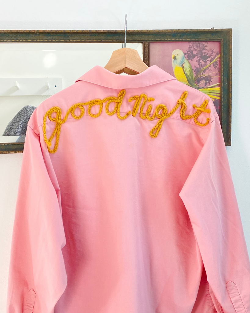 Our, Worn in to perfection, up-cylcled collection, sleep shirt edition. Each piece is one of a kind, stitched on a vintage men's dress shirt. Stitching is seen on the inside of the shirt. No two are alike.
